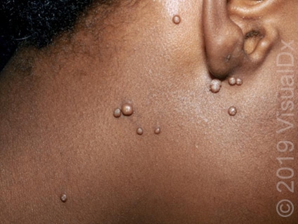 Diagnóstico diferencial e abordagem: O molusco contagioso é uma infecção viral benigna e autolimitada da pele, causada por um poxvírus, comum em crianças em idade pré-escolar e escolar. Manifesta-se por pápulas umbilicadas de 2-5 mm, de coloração da pele (peroladas ou rosadas) e aspecto translúcido/brilhante. As lesões geralmente são assintomáticas, podendo causar leve prurido; em crianças com dermatite atópica associada, pode ocorrer eczema ao redor das lesões (Dermatitis mollusca).