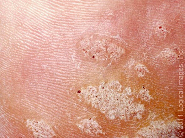 - Candidíase perineal – frequentemente coexiste; distingue-se por placas eritematosas com bordas bem definidas e pústulas satélites, acometendo pregas (dobra inguinal).
