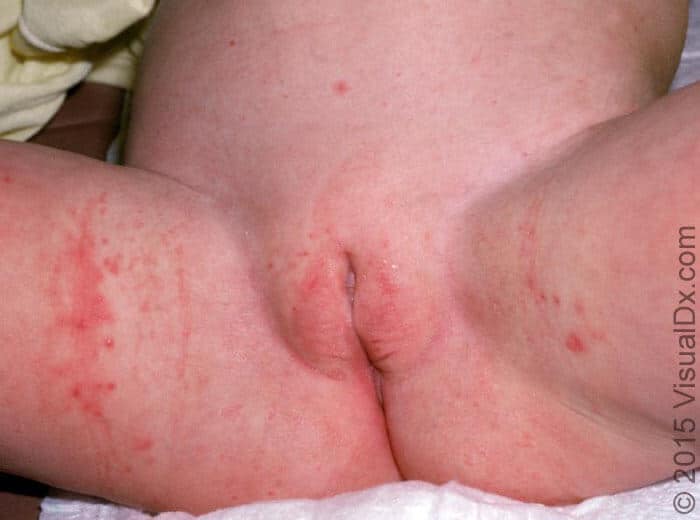 - Dermatite seborreica – em bebês pode afetar a área da fralda com lesões eritemato-descamativas, porém geralmente sem áreas de ulceração e com envolvimento simultâneo de couro cabeludo e face; surge nas primeiras semanas de vida, antes da idade típica da dermatite atópica.