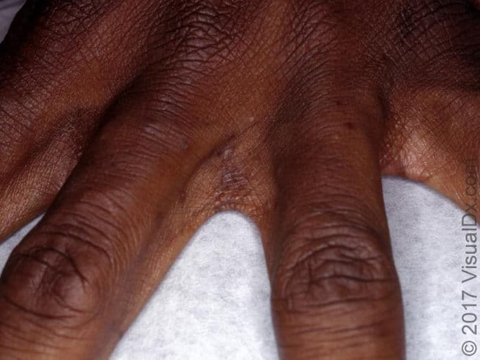 Diagnóstico diferencial e abordagem: Verrugas cutâneas são proliferações benignas causadas por papilomavírus humano (HPV), frequentes na infância. Tipicamente apresentam-se como pápulas ou nódulos hiperqueratósicos, ásperos, de tamanho variável, cor da pele ou acinzentadas, podendo surgir em mãos, dedos, joelhos, cotovelos e plantas dos pés.