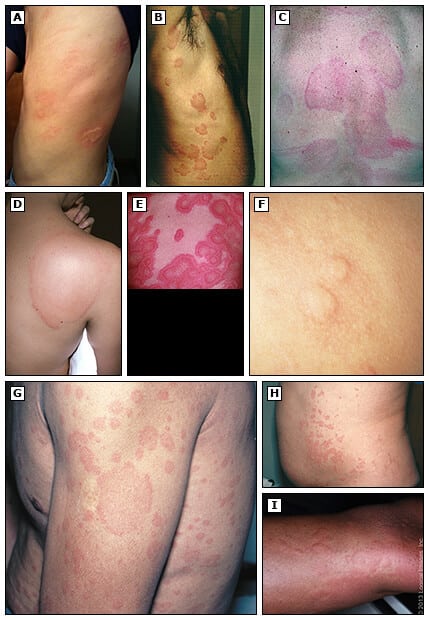 Diagnóstico diferencial e abordagem: Urticária caracteriza-se por lesões eritematosas e pruriginosas em placa (vergões) de aparecimento súbito; cada lesão individual dura menos de 24 horas e desaparece sem deixar marcas. Em crianças, a forma aguda é mais comum e costuma ser desencadeada por infecções virais, alimentos, picadas de inseto ou medicamentos.