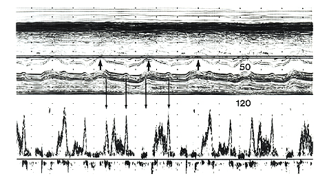 Assim, o M-mode é particularmente útil para identificar arritmias fetais e monitorar a evolução da gestação. Na imagem abaixo é possível visualizar a forma de onda Doppler simultânea da válvula tricúspide e traçado do modo M em um feto com bloqueio cardíaco completo: