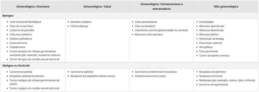 - Pré-menopausa: principalmente cistos fisiológicos (cistos funcionais, corpo lúteo, teca-lúteo), endometriomas e leiomioma uterino. Entre as neoplasias benignas neste grupo, temos os teratomas maduros e cistoadenomas.