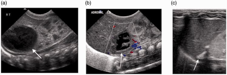 Hemorragia adrenal. (a) Corte longitudinal demonstra hemorragia aguda na adrenal direita (seta); (b) Exame Doppler ultrassonográfico revela ausência de vascularização interna em hemorragia adrenal parcialmente cística (seta); (c) Calcificação residual na adrenal (seta) observada quatro meses após hemorragia neonatal. Fonte: Aderotimi e Kraft, 2020.