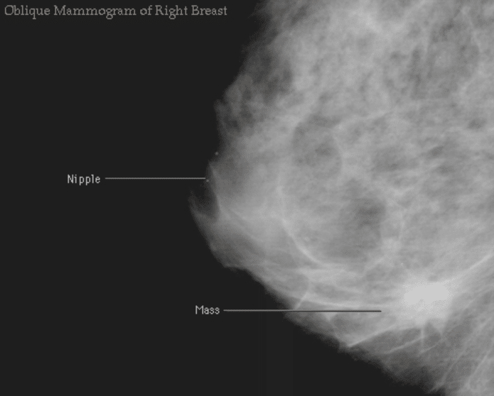 A característica mais específica é uma massa espiculada de alta densidade, que representa um câncer invasivo em quase 90% dos casos.