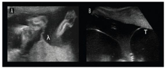Na imagem abaixo é possível visualizar o sinal do lambda [A] e o sinal do T [B], característicos das gestações gemelares di e monocoriônicas, respectivamente: