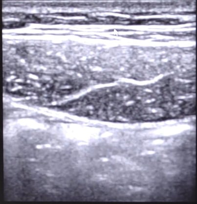 Imagem II. Imagem ultrassonografica normal da região inguinal direita. A primeira camada representa a pele, com aspecto trilaminar. Abaixo temos uma camada cutânea hiperecogênica, que faz limite com a camada parietal celular subcutâneo, rica em tecido adiposo. Na parte mais profunda, mais hiperecogênica, temos a aponeurose muscular superficial do músculo reto abdominal. O músculo se apresenta hipoecogênica. Fonte: Aula Cetrus, 2024.