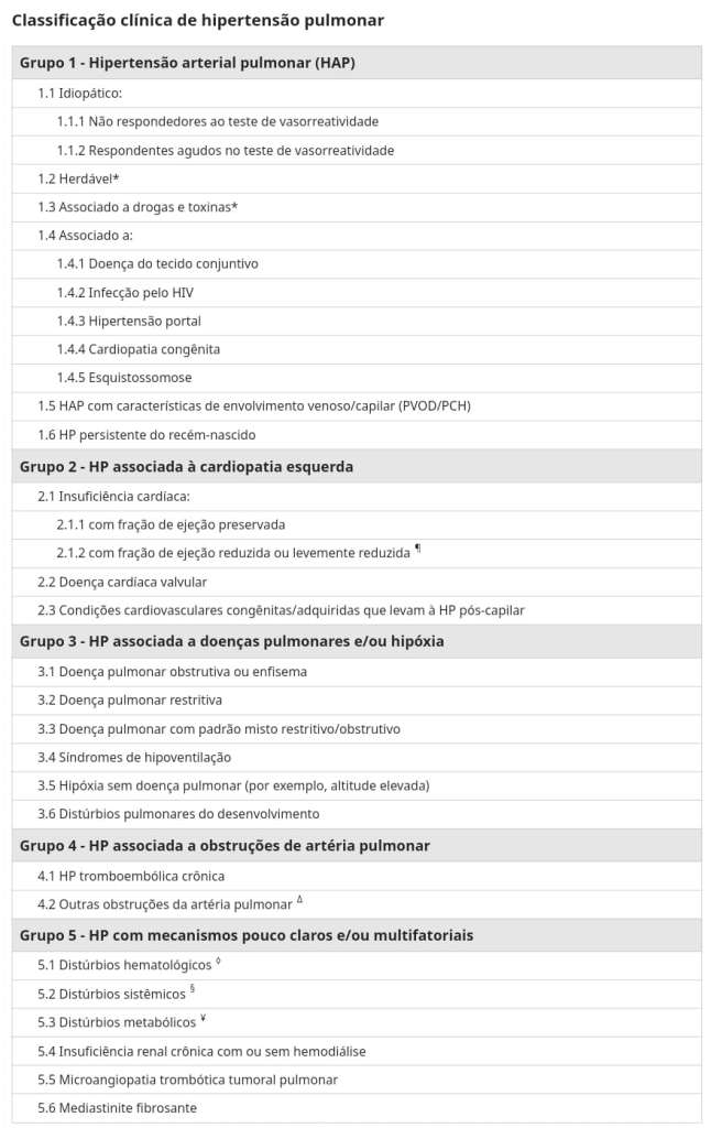 Para o início da terapia direcionada, devem ser considerados fatores como tipo de hipertensão arterial pulmonar (imagem abaixo), gravidade, grau dos sintomas e função do VD.