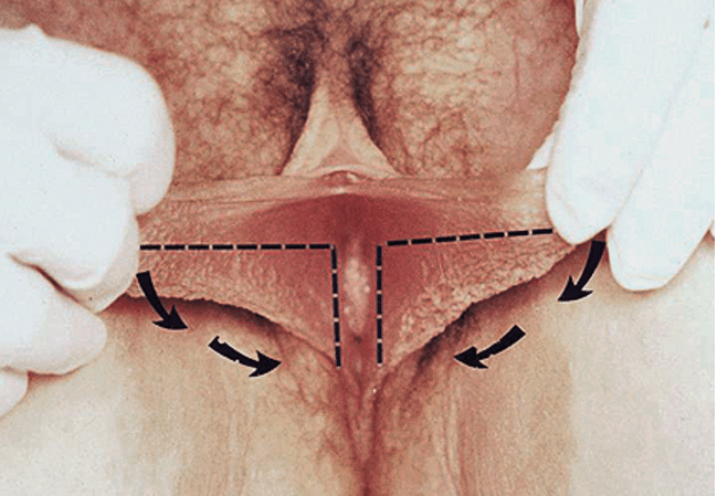 Na imagem abaixo observa-se que afasta-se os lábios lateralmente para permitir a marcação precisa da área a ser excisada. É fundamental evitar o excesso de tensão ao esticar o tecido, pois isso pode levar a uma remoção maior do que o necessário e a uma redução excessiva.