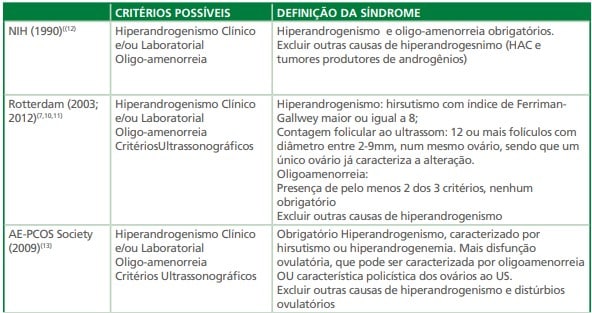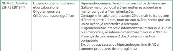 Na imagem abaixo é possível observar um resumo dos principais critérios diagnósticos para a Síndrome dos Ovários Policísticos disponibilizados pela Federação Brasileira das Associações de Ginecologia e Obstetrícia (FEBRASGO).