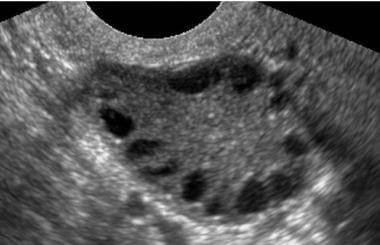Além disso, ao ultrassom, os ovários de mulheres com SOP podem conter muitos pequenos cistos, descritos como múltiplos folículos imaturos (geralmente mais de 12 folículos, cada um com diâmetro entre 2 e 9 mm), além de um aumento no volume ovariano. Esses folículos são resultado de uma falha no desenvolvimento e liberação do óvulo.