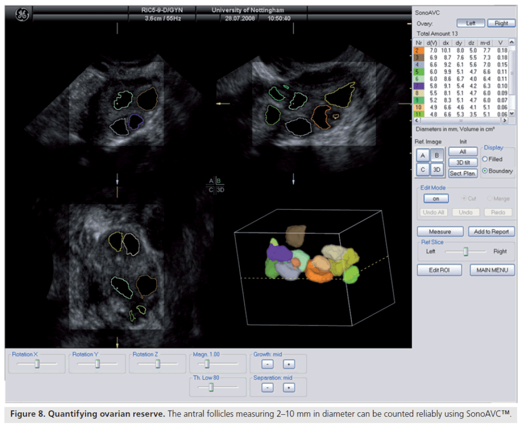 Assim, marcadores ultrassonográficos, como volume ovariano, contagem de folículos antrais e fluxo sanguíneo ovariano são fundamentais para a individualização dos protocolos de tratamento.