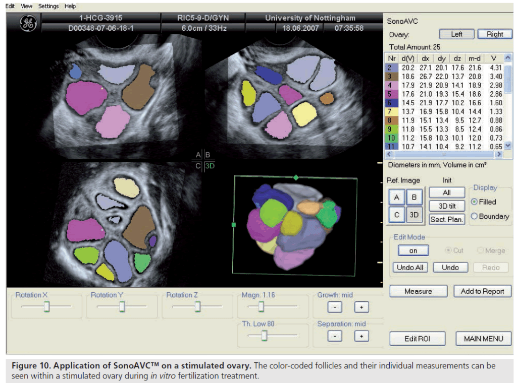 Exemplo do uso do SonoAVC™ em um ovário estimulado. É possível visualizar os folículos identificados por diferentes cores, juntamente com suas medidas individuais, durante o processo de estimulação ovariana em um ciclo de fertilização in vitro. Fonte: Jayaprakasan et al., 2010.